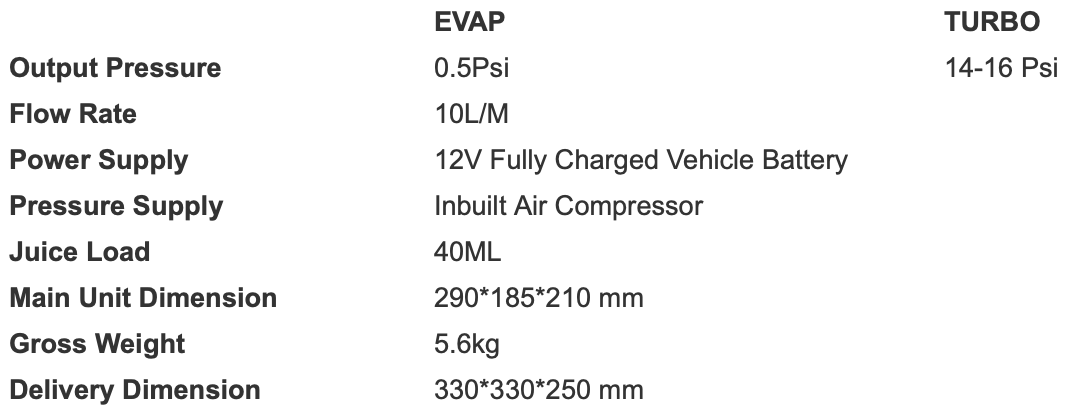 - Inbuilt air comressor with big air flow rate up to 10L/M (Turbo & EVAP model)