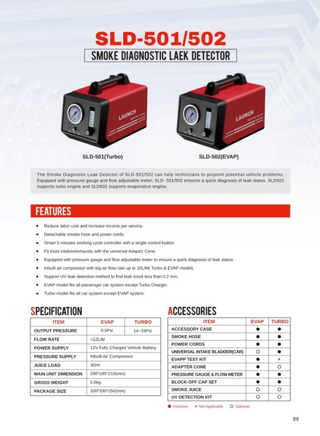 SLD501 and SLD502 smoke leaking detectors assist technicians to potential vehicle problems. It equipped with pressure gauge and flow adjustable meter to ensure a quick diagnosis of leak status.