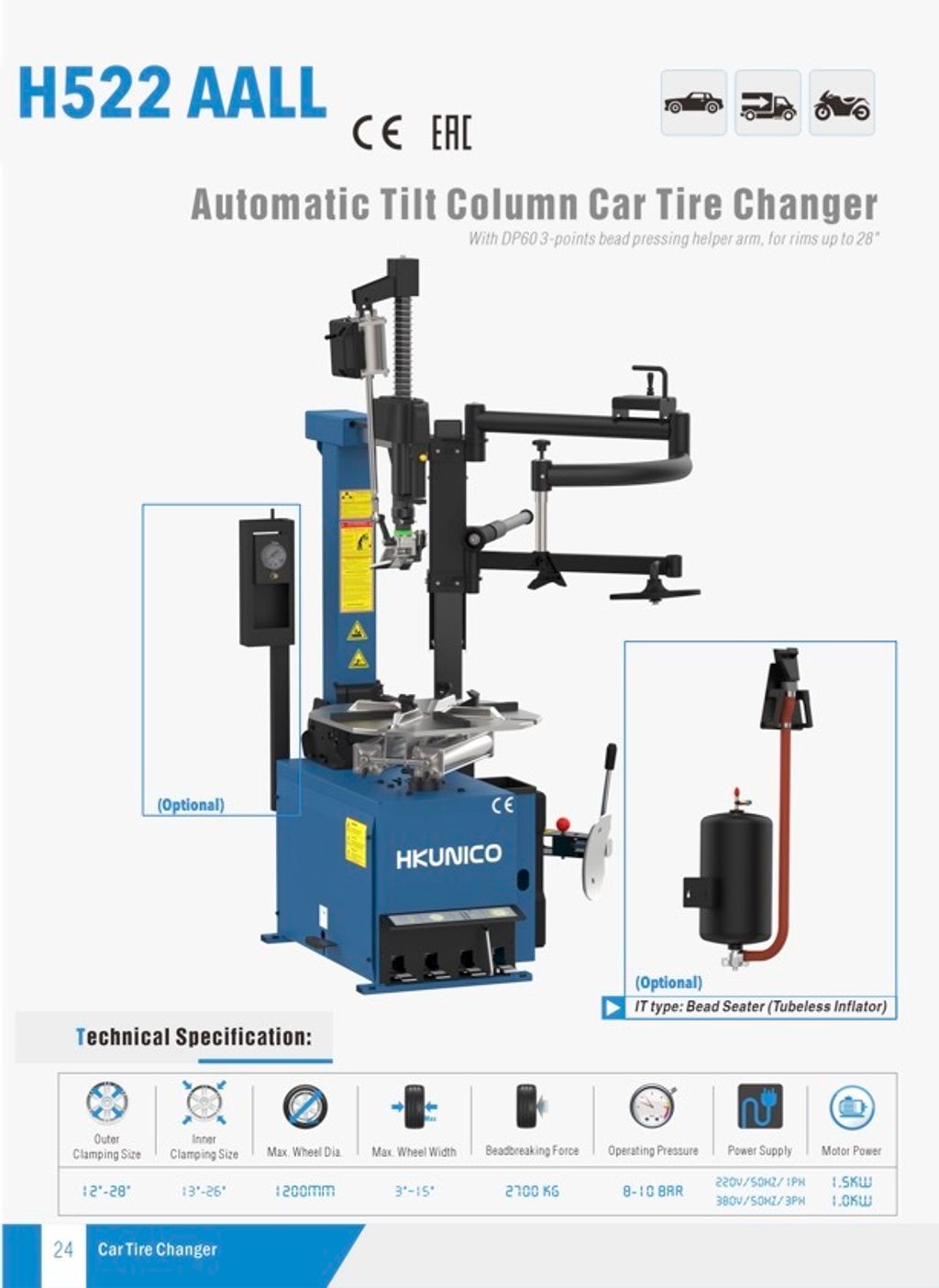 HKUNICO® H522AALL 22" Super-Automatic Leverless Tyre Changer